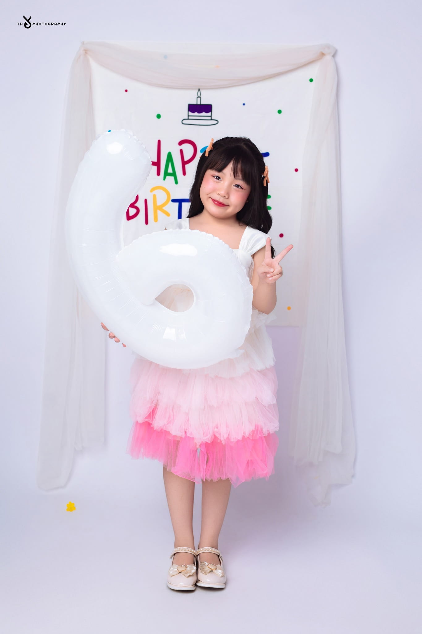 Chụp ảnh sinh nhật ở Huế với concept sinh nhật cho bé sử dụng bóng số, giúp bé thể hiện biểu cảm tự nhiên và vui tươi trong không gian studio chuyên nghiệp.